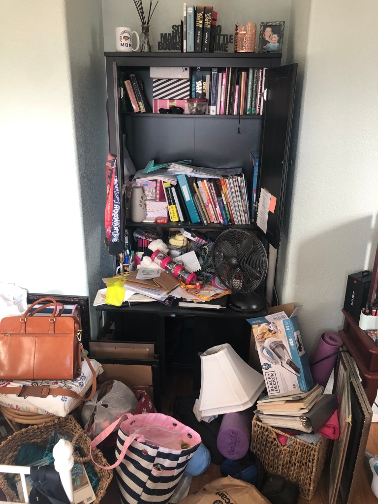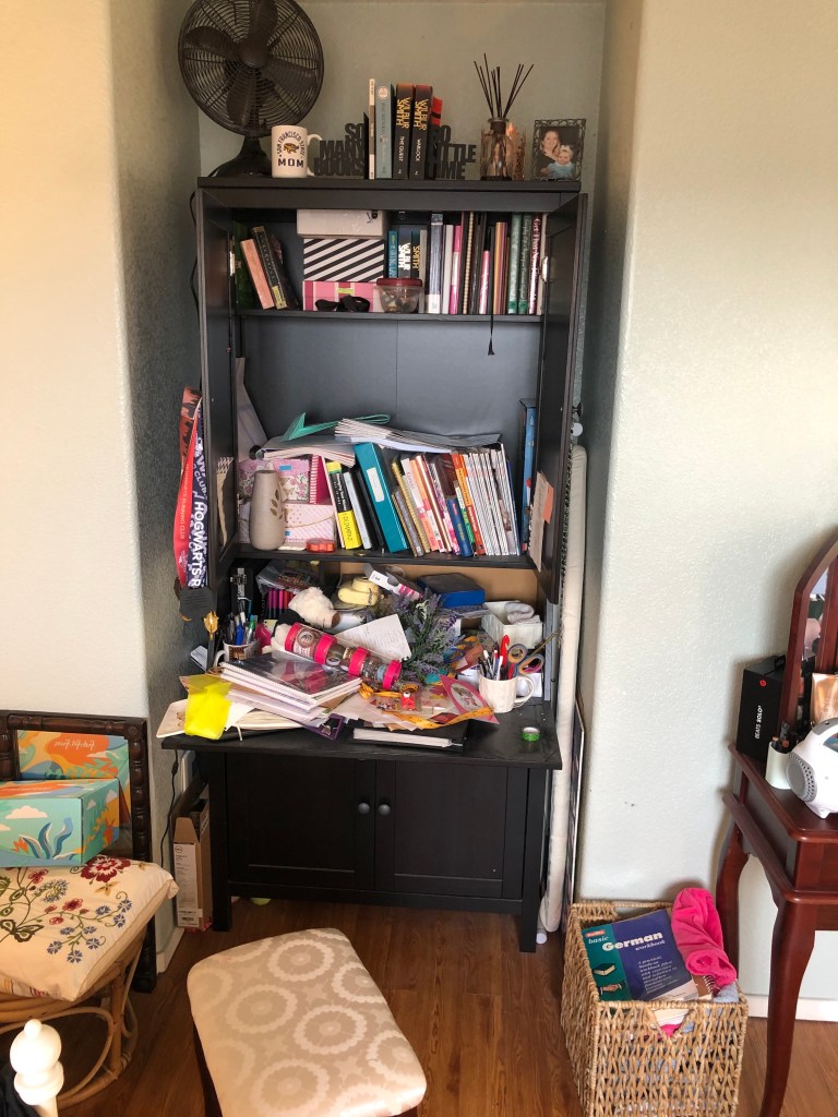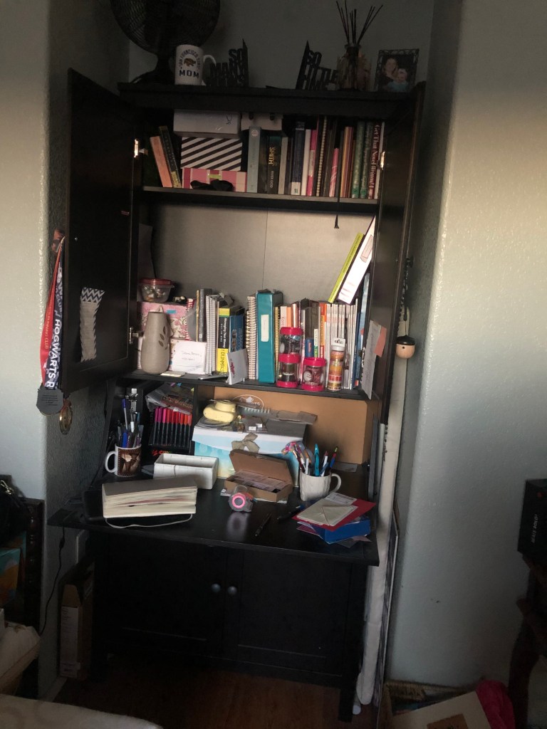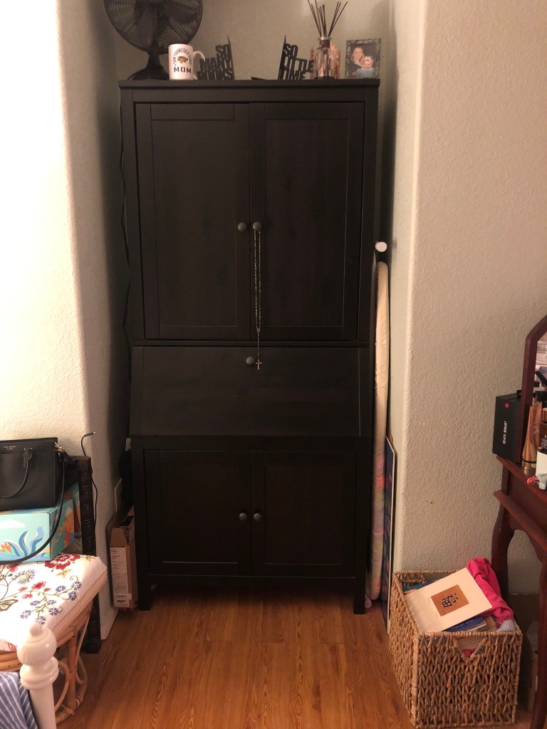 So, my “final” pictures here still show that Dell box on the left and the basket on the right with clothes to donate to the Good Will, a couple of German workbooks (I told you it was hard to let go) and a “happiness” calligraphy piece a dear friend bought me. They have all found their proper places, and I am proud to say that eight months later, that space is still clean. The only things on my open armoire desk are my fan–it’s summer in California, don’t judge me–and a couple of sheets–one in strips, waiting to be turned into a crochet rag rug, and one waiting to be cut into strips. However, they’ve been there a while, so I need to get on it before I fall back into old patterns.